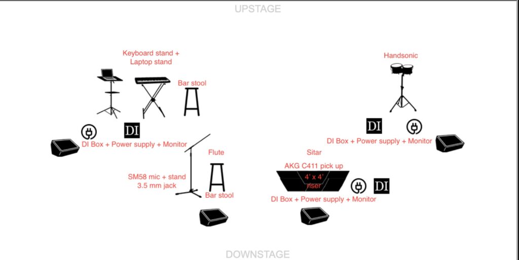 For our live performances, we follow a carefully planned stage layout to ensure smooth coordination between musicians, sound engineers, and event crew. The setup is designed to balance both melodic and percussive elements while maintaining visual symmetry and technical clarity.